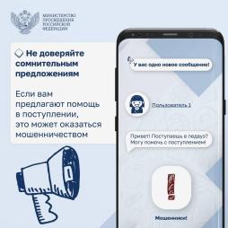 В период приемной кампании Злоумышленники обещают абитуриентам «решить вопрос» с поступлением в вузы на бюджет. Предлагают поступающим и их родителям за плату помочь в поступлении на бюджетные места. Действуют они якобы от имени Минобрнауки.